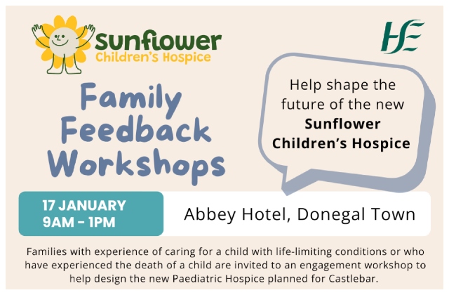 Families with lived experience of caring for a child with a life-limiting illness, or who have experienced the death of a child, are invited to take part in a family engagement workshop with Mayo Roscommon Hospice / HSE. The workshop will help inform the design and development of the proposed Sunflower Children’s Hospice, a major new healthcare project for the region. The state-of-the-art children's hospice which is planned for Castlebar, County Mayo will provide essential care for children with life-limiting illnesses and their families across counties in the West and North West.